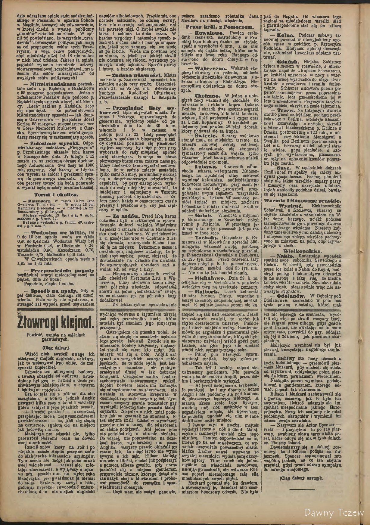 — Tczew. Na tutejszym dworcu krótko przed nadejściem pociąga przejściowego z Berlina, złodzieje kieszonkowi korzystając z natłoku, skradli mistrzowi blacharskiemu p. Kalince z Drezna portmonetkę z 122 mk., a mistrzowi rzeźnickiemu Mennigowi z Steglltz pod Berlinem portmonetkę z