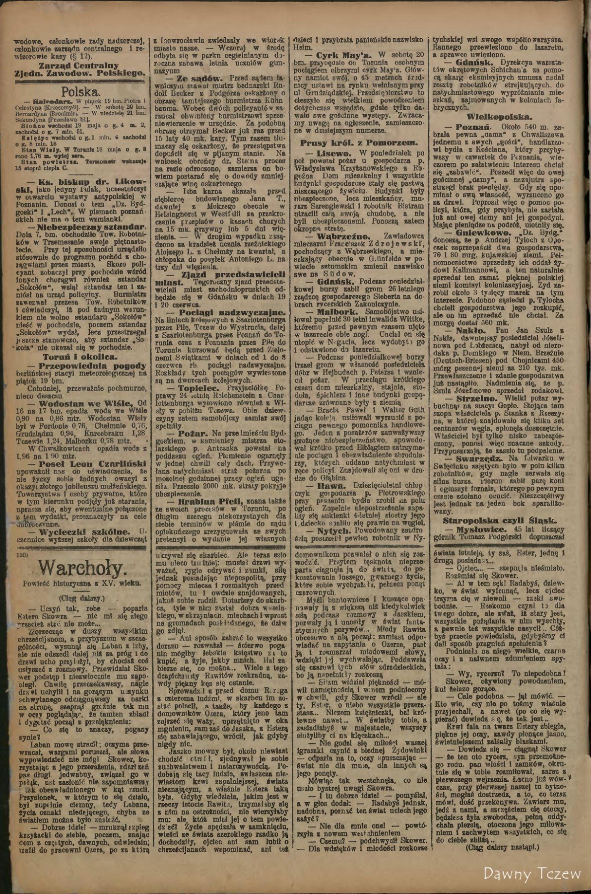 — Tczew. Na tutejszym dworcu zdarzyły się dwa nieszczęśliwe wypadki. Zwrotniczego Hinzego pochwyciła lokomotywa i odrzuciła na ubocze, a palacz Bogusch jadąc na maszynie przechylił się zbytnio i uderzył głową o słup telegraficzny. Ciężko rannych przewieziono do lazaretu.