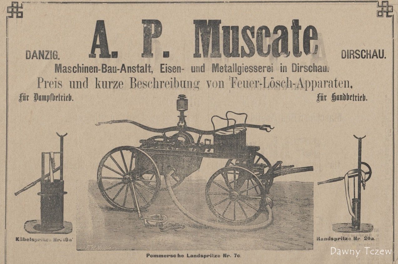 Jeden to własnego pomysłu ("system Muscate"), a więc zapewnie wytwarzany w Tczewie, bukownik, czyli łuszczarka do koniczyny, przeznaczony do współpracy z młockarniami o szerokości bębna roboczego 42-60 cali, sprzedany już ponad setce zadowolonych klientów, których lista i podziękowania zajmują przeszło połowę powierzchni reklamowej. Na pierwszym miejscu reklamowego dodatku znajduje się jednak coś, co może zaskakiwać i raczej nie było dotąd kojarzone z firmą A. P. Muscate, a mianowicie "sikawki" strażackie, dosłownie "aparaty gaśnicze". W bogatym wyborze dostępnych było ponad 30 asortymentów o napędzie ręcznym lub parowym, przenośnych, przejezdnych oraz mobilnych, przystosowanych do trakcji konnej. Jedne dedykowane były głównie do celów gaśniczych, inne przeznaczone mogły być także do zastosowań gospodarczych, jak model nr 21 z pompą uniwersalną do "gęstych cieczy".