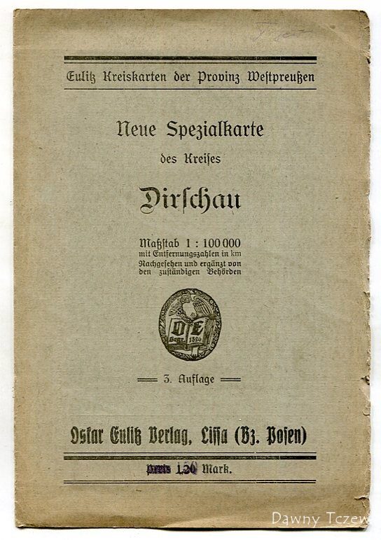 Na górze widnieje nazwa serii map: „Eulitz Kreiskarten der Provinz Westpreußen”, czyli „Mapy powiatowe prowincji Prusy Zachodnie”. Poniżej znajduje się główny tytuł: „Neue Spezialkarte des Kreises Dirschau”, co można przetłumaczyć jako „Nowa mapa specjalna powiatu tczewskiego”.